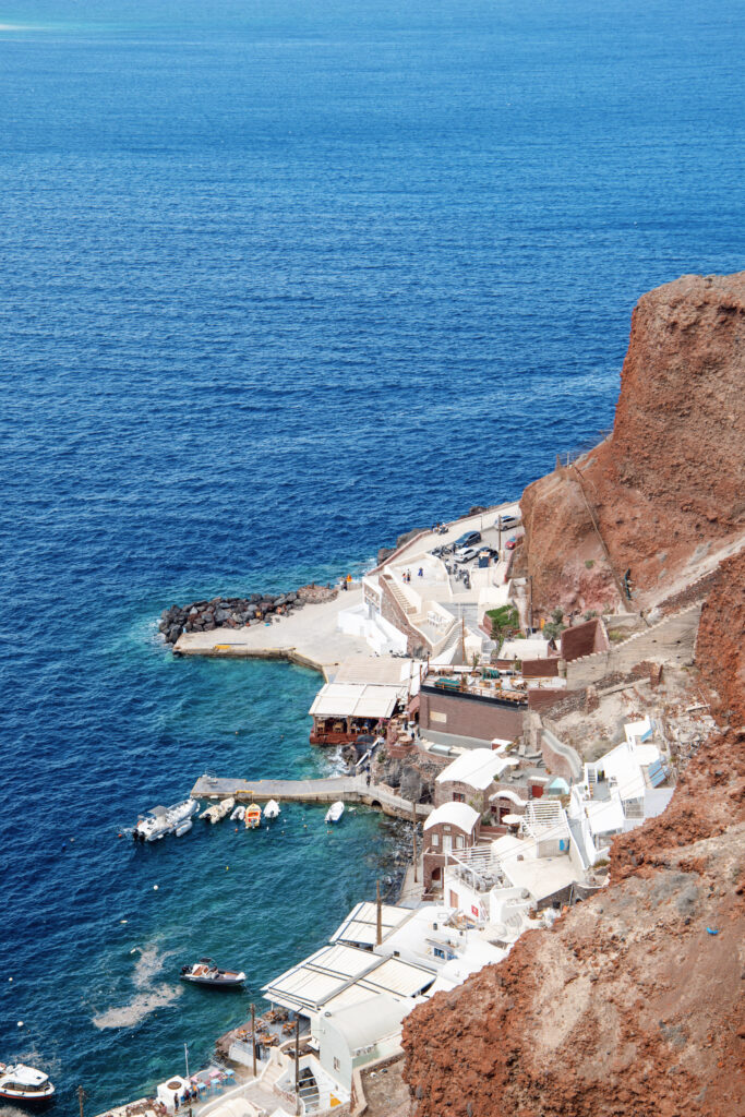 Ammoudi Bay feels like a completely different world compared to Oia, even though it’s right below it. It’s one of those places that makes you slow down whether you planned to or not. Picture waterfront restaurants, calm clear water, and a much more laid-back vibe. You’ll also see a lot of people doing a boat tour leaving from here, which is something I’d definitely consider adding to your itinerary if you have the time.
