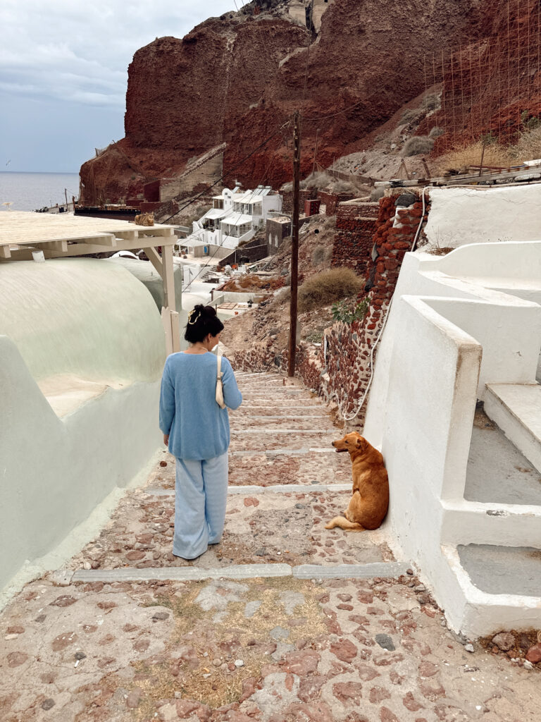 Getting there is part of the experience. You’re looking at around 300 steps down from Oia, which sounds like a lot because it is, but I still think it’s 100% worth it. This is where my “wear sneakers and bring cute shoes to change into” travel rule really came in handy. I wore sneakers for the walk down and switched once we got there, and it made the whole thing way easier. If the climb back up sounds like a lot, you do have the option to ride a donkey, which some people use instead of walking.