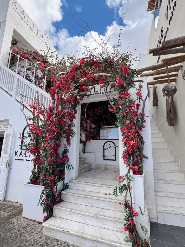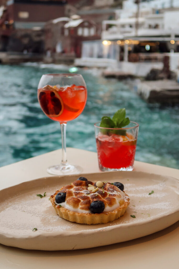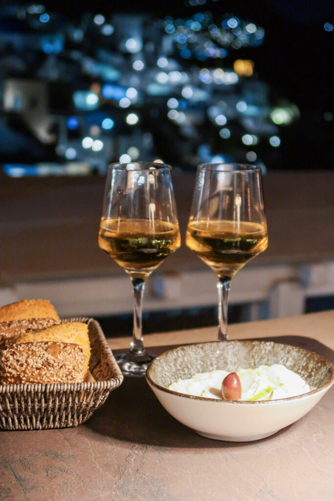 For dinner, this is where I’d say it’s worth planning ahead a little. Ambrosia and Emfasis were two spots that really stood out to us. Both have that romantic, cliffside setting with unobstructed caldera views, and if you time your reservation around sunset, it completely changes the experience. It turns dinner into something you’ll actually remember, not just another meal.