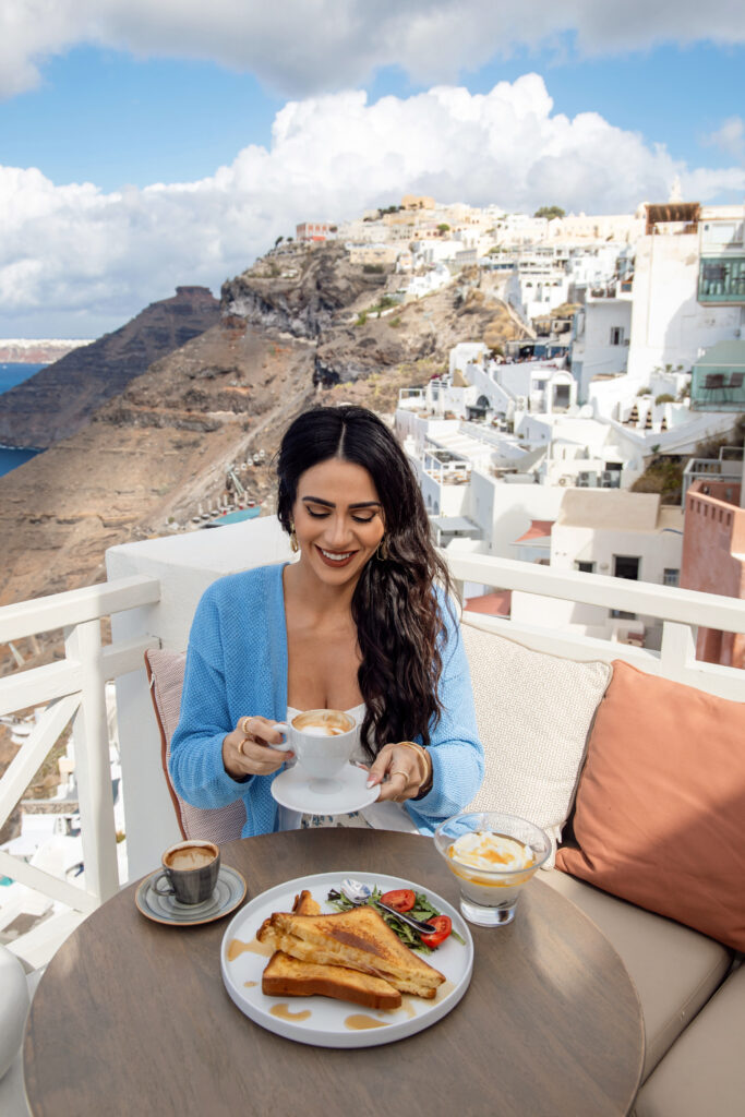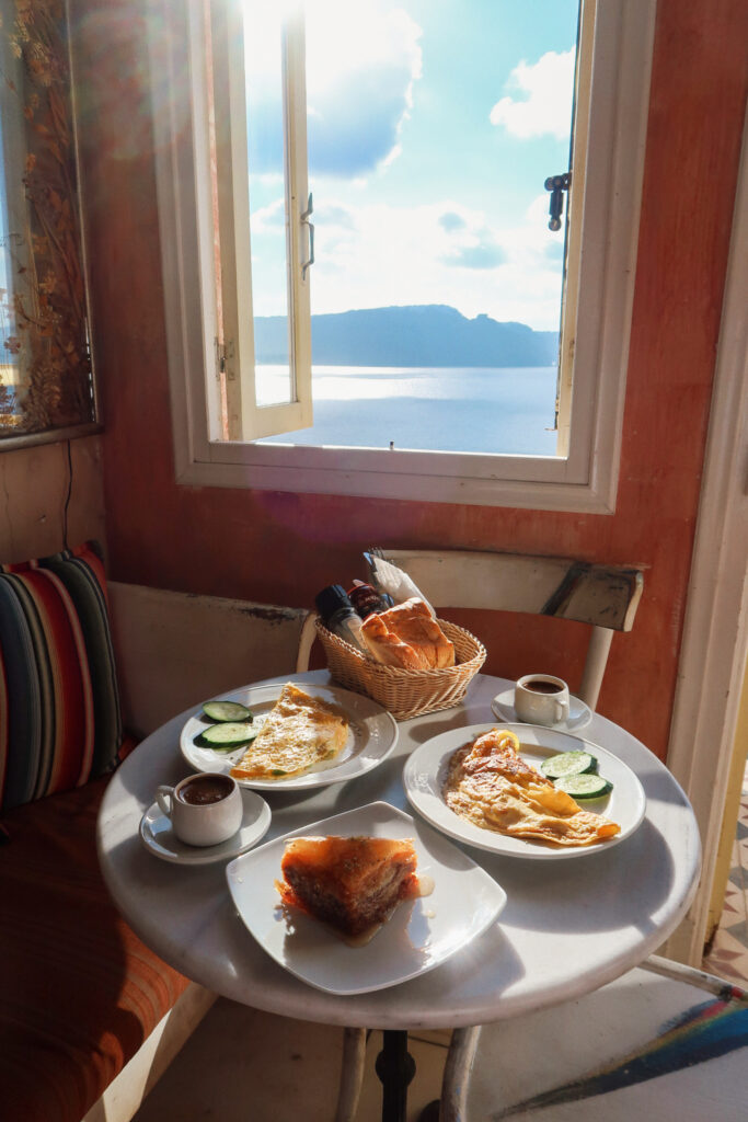 We loved starting our mornings slow at Meteor Café in Oia. It was one of those places we’d go before everything got busy, grab Greek coffee and breakfast, and just sit there taking in the views while the island was still quiet. Those ended up being some of my favorite parts of the day.