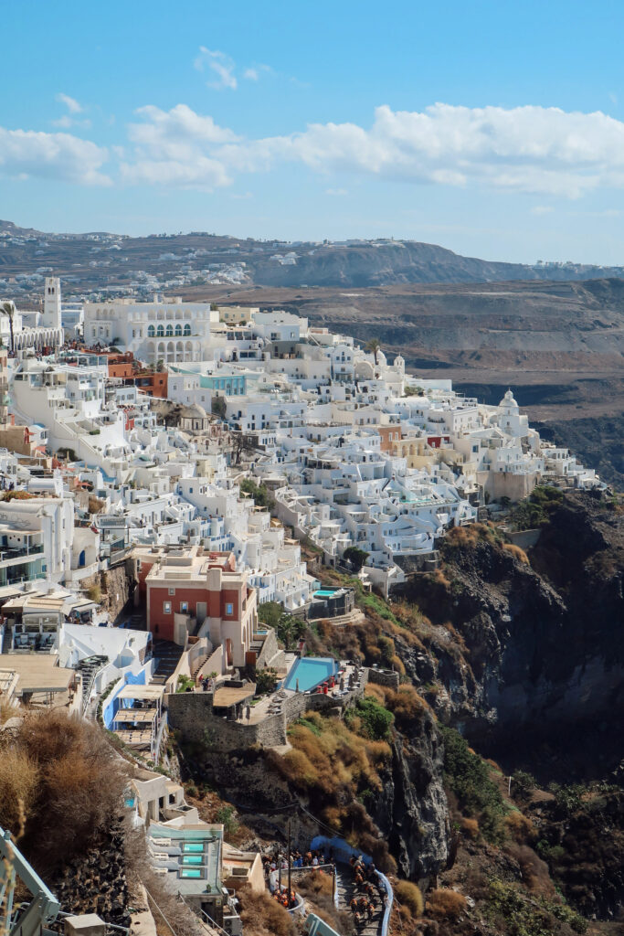We stayed in Oia, so coming to Fira for a change of pace felt like a good little reset. We went in the late morning before it got too busy, grabbed a coffee, and just wandered with no real plan, which is kind of the best way to do it. If you’re coming up from the old port, taking the cable car ride in Fira is such a fun way to arrive, it’s quick, saves you the steep walk, and the views the whole way up are unreal.