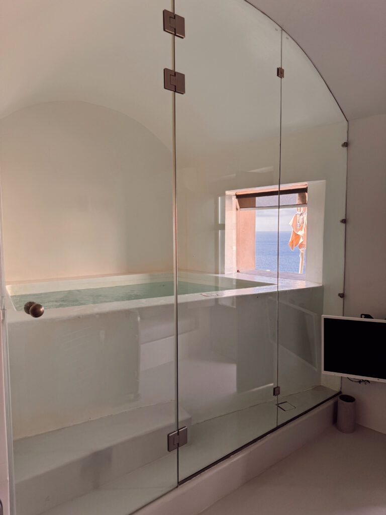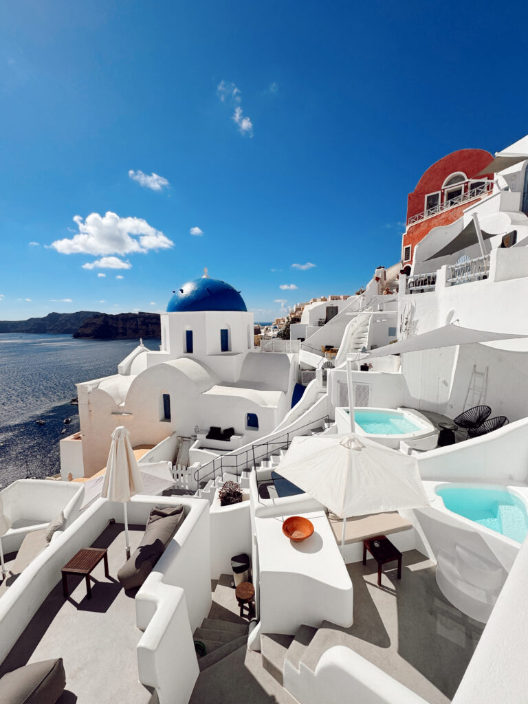 We stayed at Oia Spirit, which had a pool and our own private jacuzzi overlooking the blue domes, and also at Old Castle Oia, which had an infinity pool right over the caldera. Both were unreal in their own way.